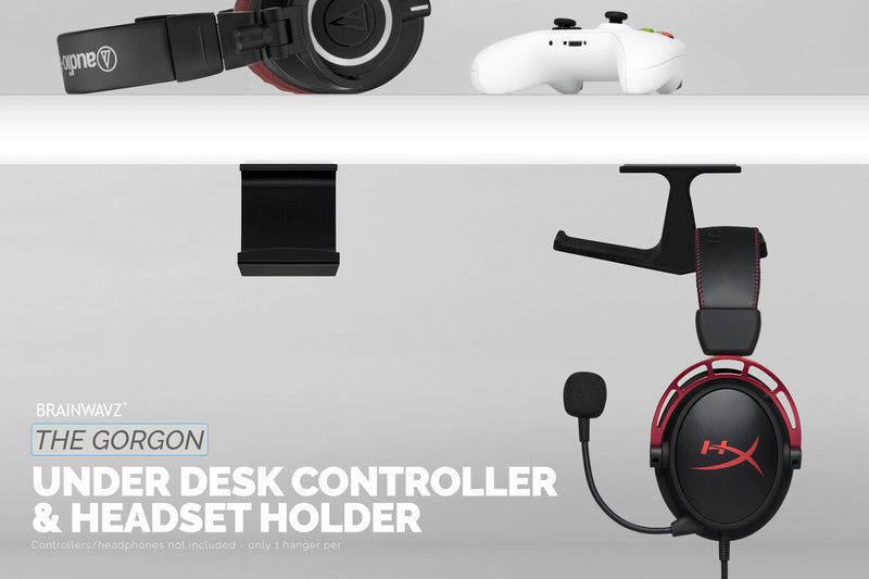 That area under your desk is not just for shoving your knees into, or hiding a spaghetti junction of cables, it can also be a place to store your gaming gear. Use some of that free space and install The Gorgon, a space saving hanger for your headset and game controller - keep your game space clean and clutter free.